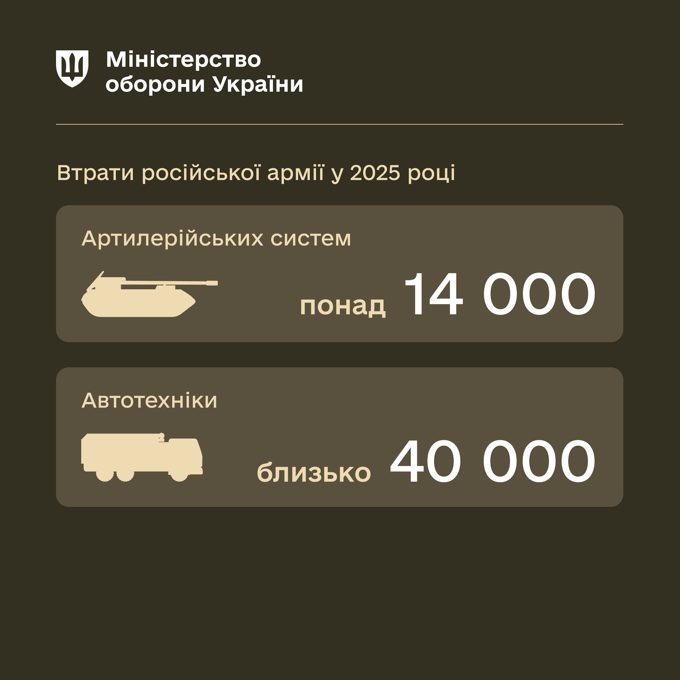 Також у 2025 році українські воїни уразили величезну кількість озброєння та техніки російської армії. Зокрема понад 14 000 ворожих артсистем. Це найбільший показник за всі попередні роки війни. Загалом від початку повномасштабного вторгнення російська армія втратила 35 678 артсистем.