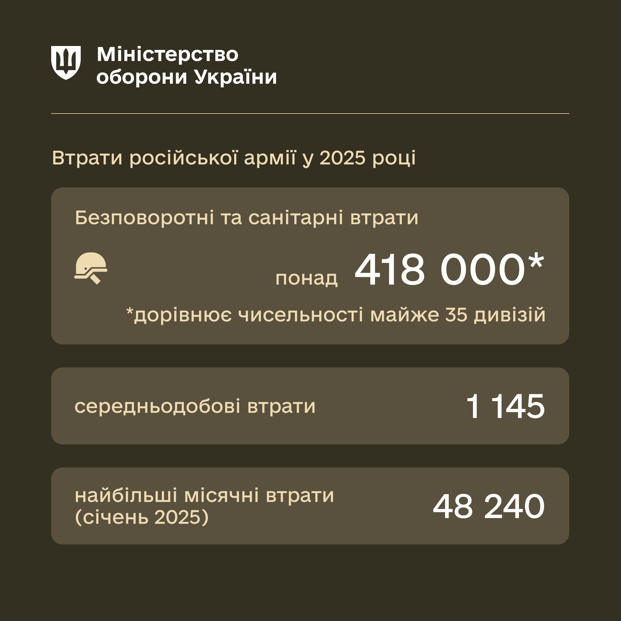 Безповоротні  та санітарні втрати російських окупаційних військ впродовж 2025 року склали понад 418 000 солдатів, що дорівнює чисельності майже 35 дивізій. Щодня у 2025 році Росія у середньому втрачала 1 145 солдатів.