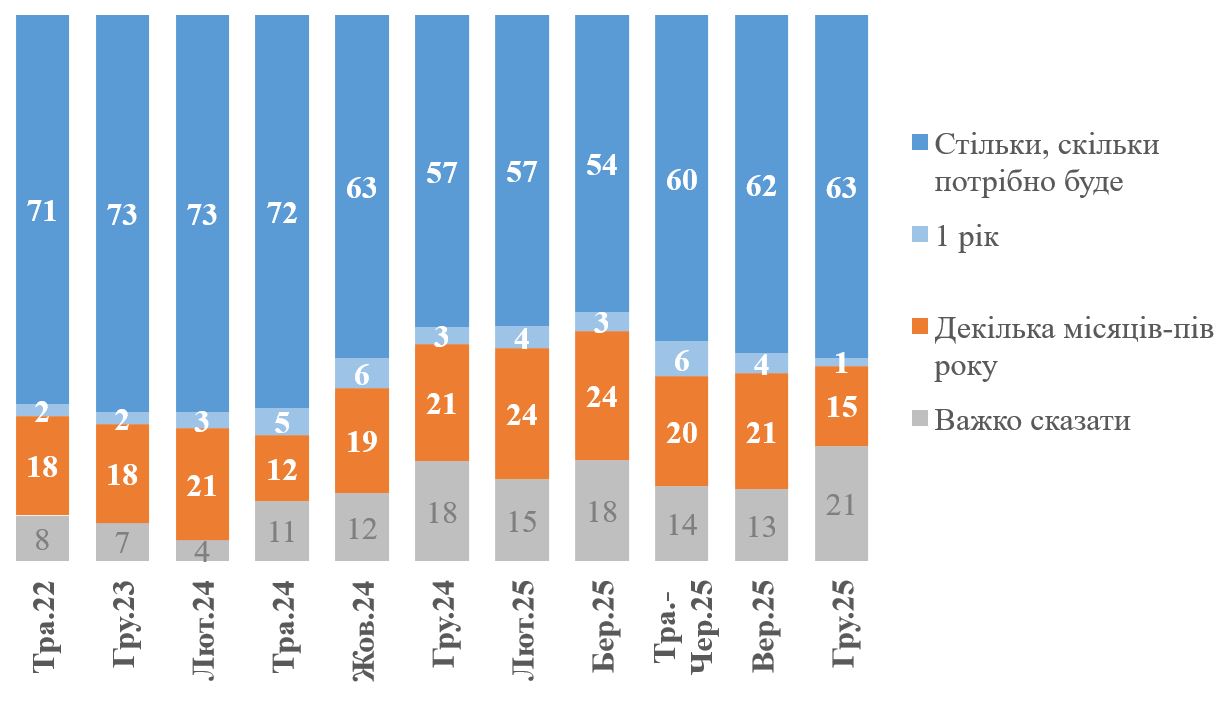 Частка тих, хто називає коротші терміни – кілька місяців або до пів року, – становить 15%. Соціологи зауважують, що цей показник зменшився порівняно з вересневим опитуванням, однак суттєво зросла кількість респондентів, які не змогли визначитися з відповіддю.