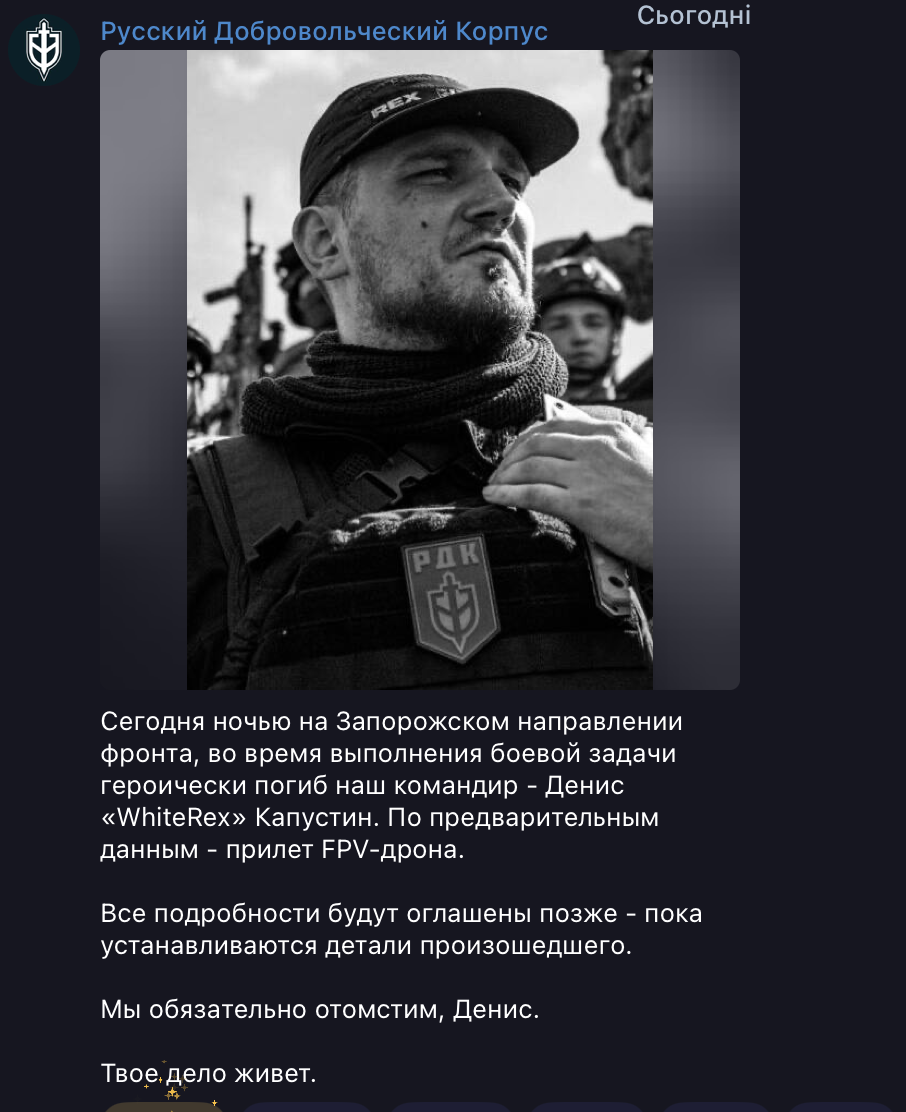 Сьогодні вночі на Запорізькому напрямку фронту під час виконання бойового завдання героїчно загинув командир Російського Добровольчого Корпусу (РДК) Денис Євгенович Капустін, відомий під позивним White Rex або Денис Нікітін. За попередніми даними, причиною смерті став удар FPV-дрону.