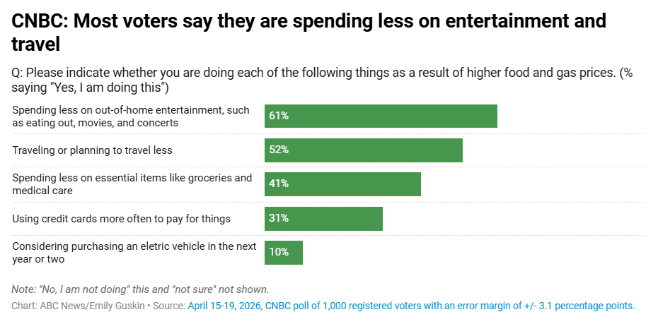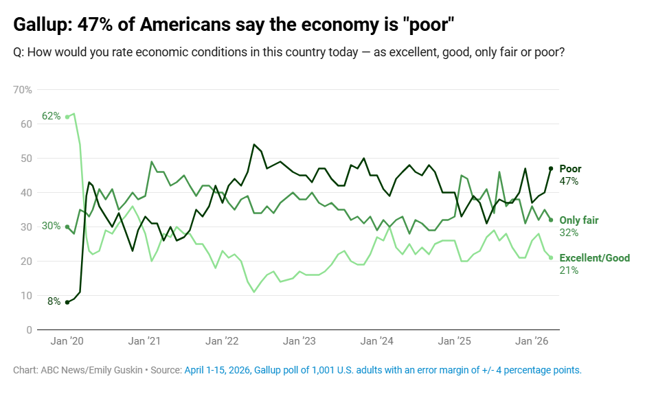 Проте споживчі настрої свідчать про протилежне. За даними CNBC, понад 90% громадян відчули на собі стрибок цін на пальне, а 82% скаржаться на дорожчання продуктів харчування. Кожна друга родина називає витрати на житло та медицину критичною проблемою. Додатковим тягарем стала війна в Ірані: 64% виборців вважають, що цей конфлікт не виправдовує зростання вартості бензину.