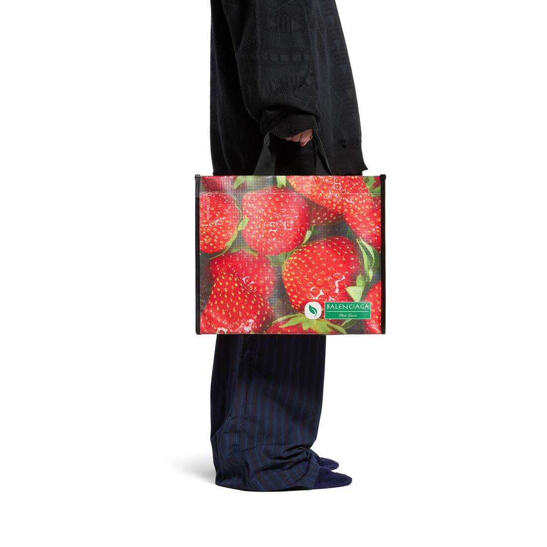 На сайті компанії зазначають, що сумка зроблена з “чорної телячої шкіри Nappa із вегетаріанським і полуничним принтом”.