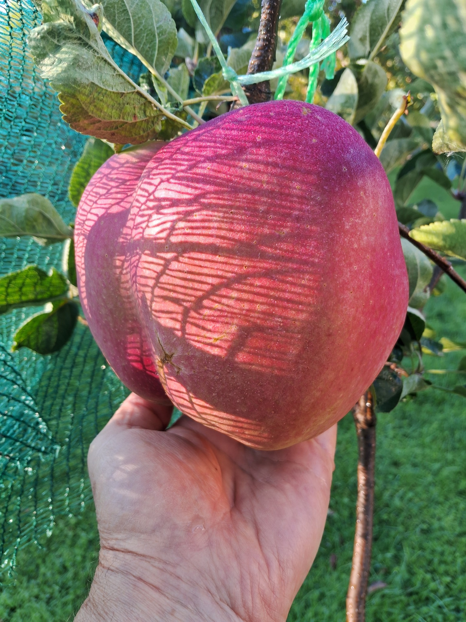 Серед 10 трьохрічних яблунь, які Юрій висадив у своєму саду, був один “важковаговик” французької селекції – сорт “Джумбо Помм” (Jumbo Pomme). Цікаво, що на саджанці під час цвітіння спершу зав’язалося три плоди, але залишився лише один. Головний козир цього сорту – великі плоди, – зазначила вона.