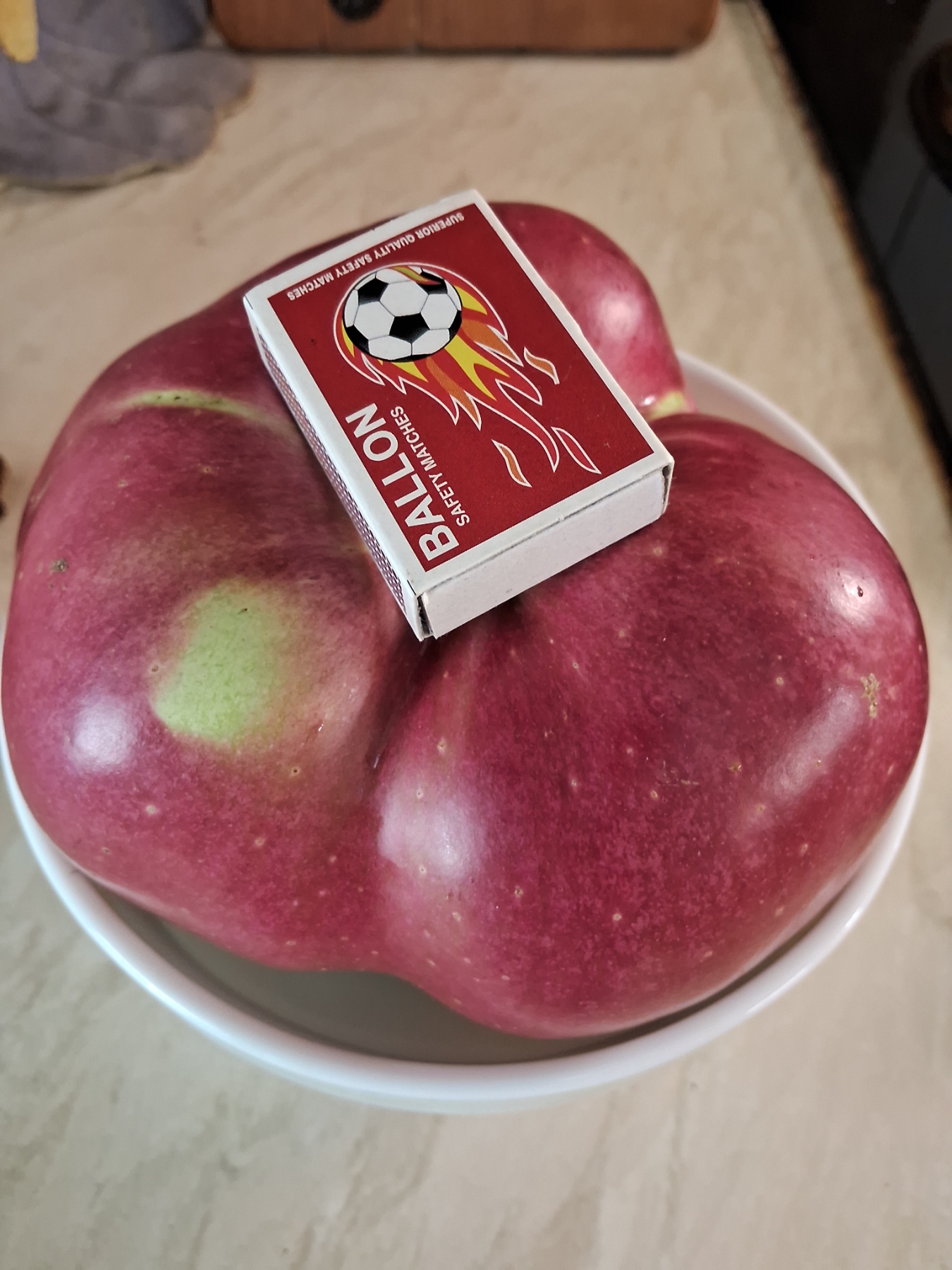 Серед 10 трьохрічних яблунь, які Юрій висадив у своєму саду, був один “важковаговик” французької селекції – сорт “Джумбо Помм” (Jumbo Pomme). Цікаво, що на саджанці під час цвітіння спершу зав’язалося три плоди, але залишився лише один. Головний козир цього сорту – великі плоди, – зазначила вона.