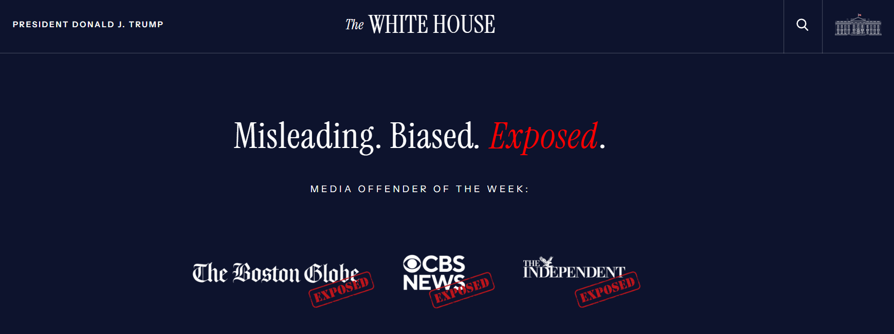 Сторінка має назву “Зала ганьби для правопорушників”. До списку внесли майже всі провідні ЗМІ США, зокрема The Washington Post, CBS News, CNN, msnbc, The New York Times, Politico та інші.