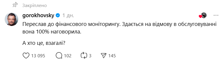 “Переслав до фінансового моніторингу. Здається на відмову в обслуговуванні вона 100% наговорила. А хто це, взагалі?”, – написав він.