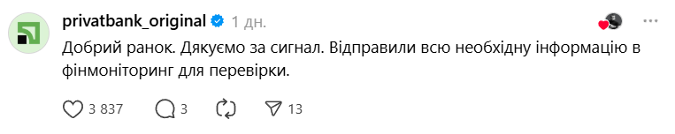Зреагували і в “ПриватБанку”, додавши, що також відправили всю необхідну інформацію у фінмоніторинг для перевірки.