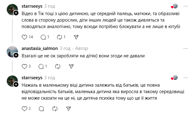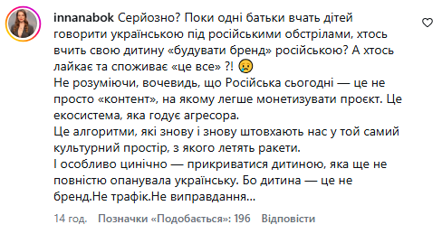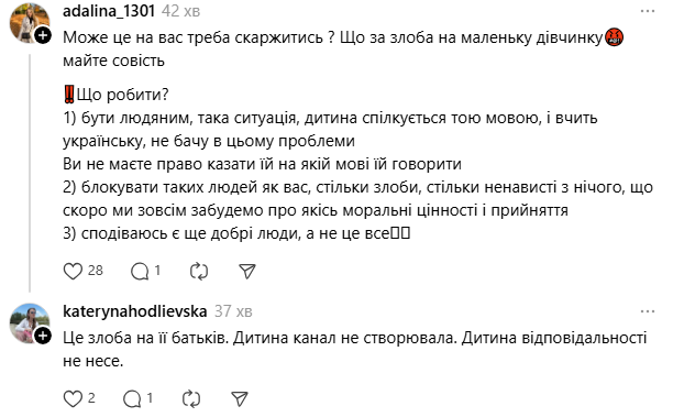 “Після публічного обговорення у коментарях почали з’являтися страшні речі. Заклики до булінгу. Заклики до фізичної агресії. І все це щодо маленької дитини. Це вже не дискусія і не “громадська позиція”. Це цькування дитини. Просимо зупинитися і не робити маленьку дитину мішенню для агресії“, – заявила інфлюєнсерка.