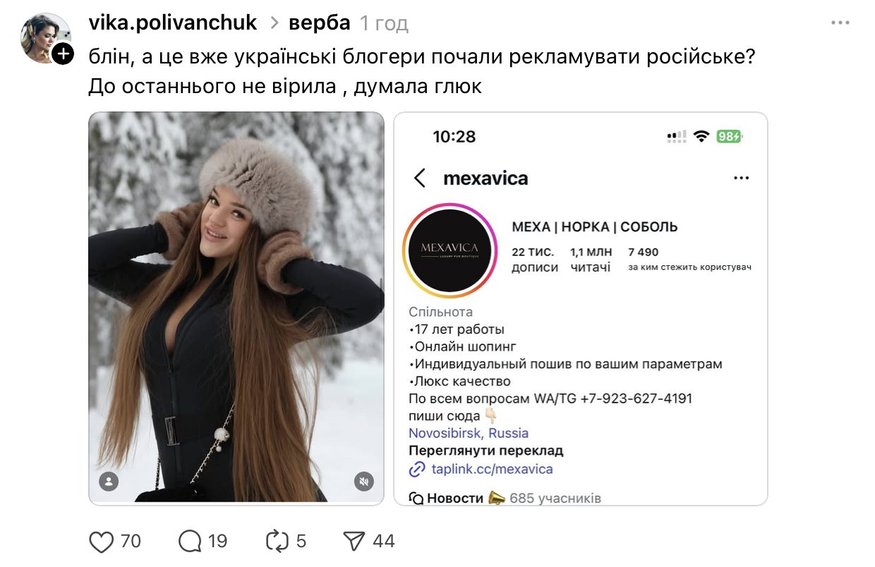 Проте це не єдиний скандал, який за участі блогерки. Вдруге вона оскандалилась, прорекламувавши російський магазин хутра.