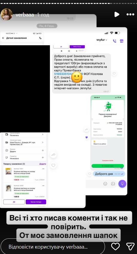 У сторіз Юля Верба запевнила, що купувала шапку в Україні та надала докази – скриншот з покупкою товару.