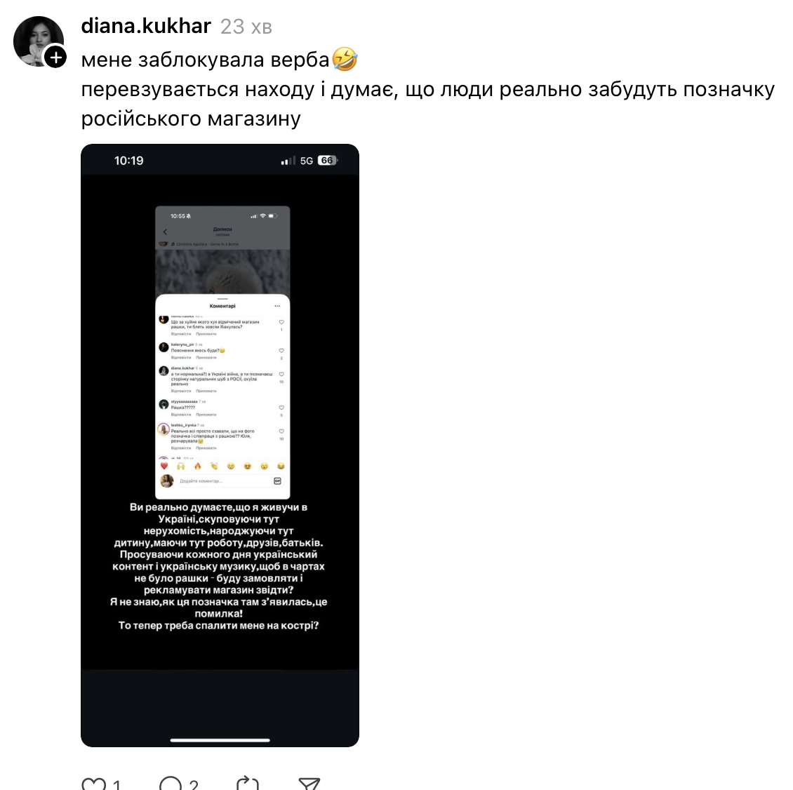 Верба опублікувала допис, у якому поставила відмітку з російським магазином.