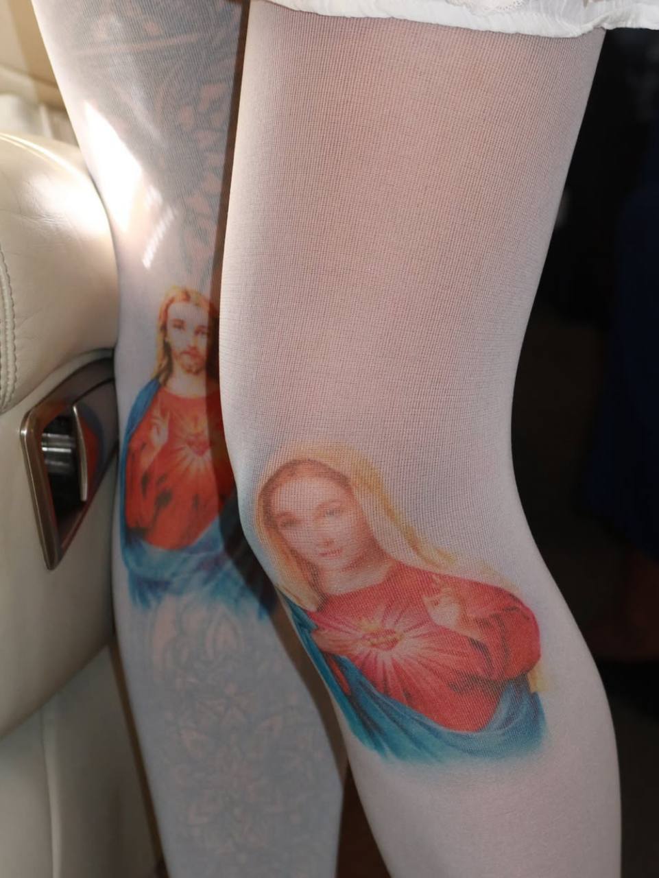 Блогерку Тетяну Коряк розкритикували за колготи з релігійним принтом на колінах