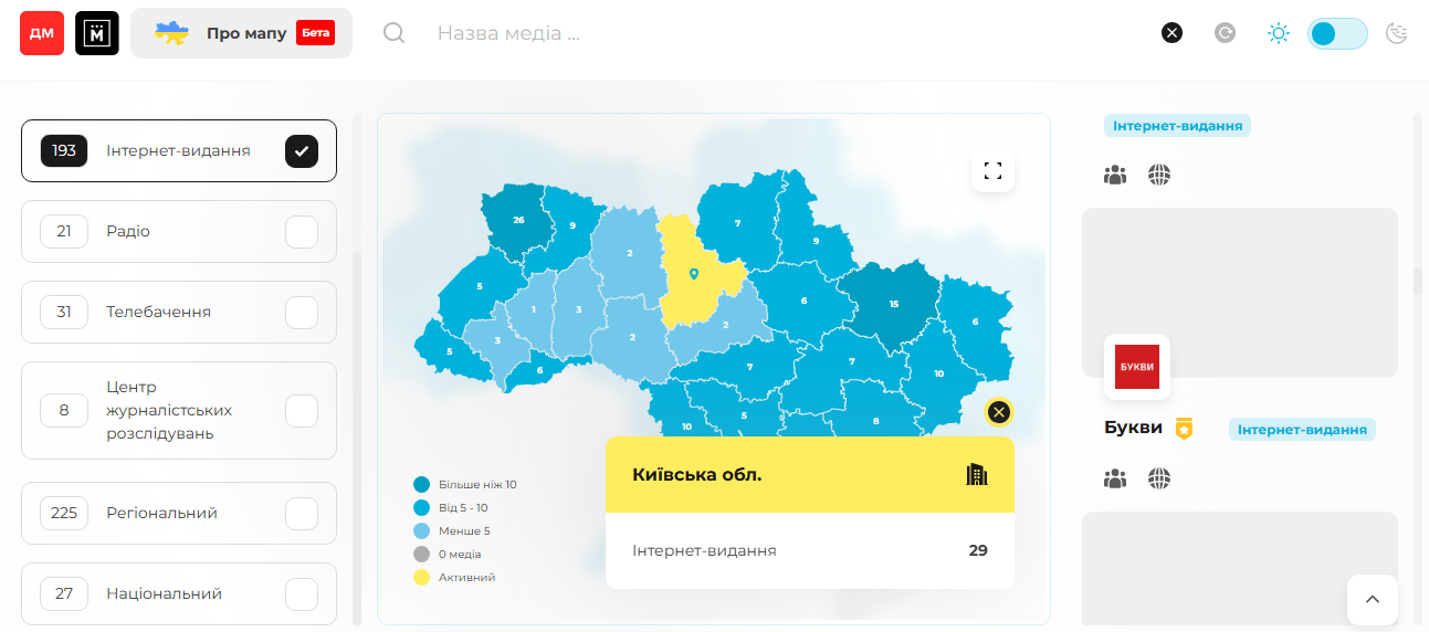 Зокрема, до переліку інтернет-видань у Київській області потрапило 29 медіа. Серед них: Букви, LB.ua, НЗЛ, Новинарня, Суспільне Новини, Інтерфакс-Україна, Militarnyi, #ШОТАМ, Український тиждень, Радіо Свобода Україна та інші.
