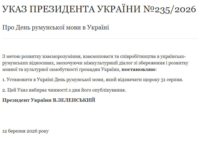 12 березня президент Володимир Зеленський підписав указ, котрим запровадив в Україні День румунської мови 31 серпня.