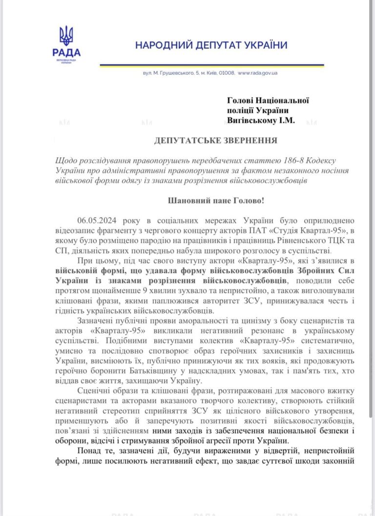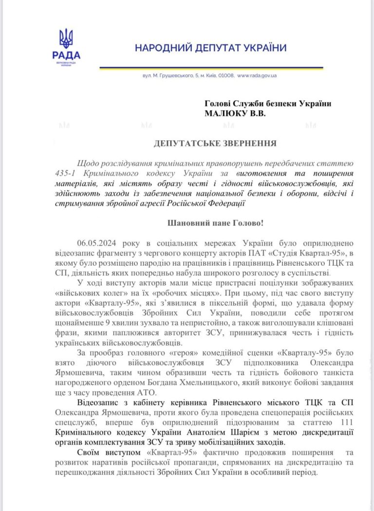 Депутати з фракції “Європейська Солідарність” звернулися до СБУ з вимогою відкрити кримінальне провадження проти студії “Квартал 95” за статтями Кримінального кодексу України про перешкоджання законній діяльності ЗСУ, виготовлення та поширення матеріалів, які містять образу честі і гідності військовослужбовців.