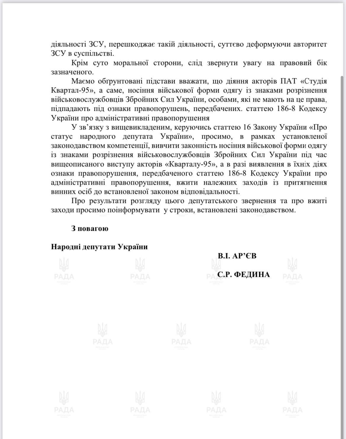 За словами нардепки Софії Федини, народні депутати у своєму зверненні вказують: сценічні образи та клішовані фрази, розтиражовані для масового вжитку сценаристами та акторами творчого колективу, створюють стійкий негативний стереотип сприйняття ЗСУ як цілісного військового утворення, применшують або й заперечують позитивні якості військовослужбовців, повʼязані зі здійсненням ними заходів із забезпечення національної безпеки і оборони, відсічі і стримування збройної агресії проти України.