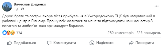 Дорогі брати та сестри, після прибування в Ужгородському ТЦК був направлений в учбовий центр в Рівному. Прошу всіх молитися за мене та підтримувати наш монастир. З повагою та любовʼю ваш архімандрит Варлаам, – мовиться у дописі.