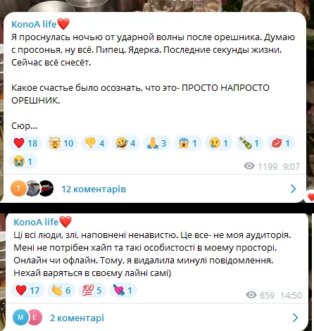 “Я прокинулася вночі від ударної хвилі після “Орєшніка”. Думаю спросоння – ну все. Піпець. Ядерка. Останні секунди життя. Зараз усе знесе. Яке щастя було усвідомити, що це – ПРОСТО-НАПРОСТО “ОРЄШНІК”. Сюр…”, – написала Анастасія, викликавши гостру критику з боку користувачів за недоречний сарказм та використання російської мови. (ред. текст повідомлення перекладено з російської).