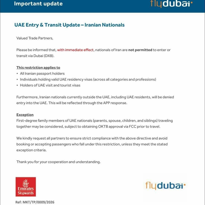 Об’єднані Арабські Емірати запровадили сувору заборону на в’їзд та транзитне сполучення для громадян Ірану. Відповідне розпорядження, яке набуло чинності негайно, було оприлюднено в офіційному повідомленні авіакомпанії FlyDubai для пасажирів.
