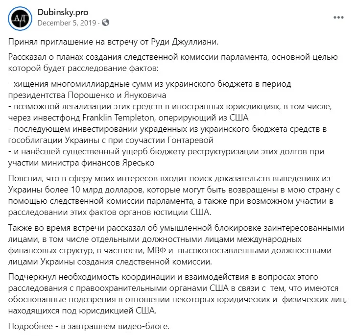 За кілька днів після тієї пресконференції Дубінський опублікував фото з Руді Джуліані, тодішнім адвокатом Дональда Трампа та його повіреним. На зустрічі, за словами Дубінського, обговорювалось створення ТСК у ВР України, яка б розслідувала звинувачення Дубінського у розкрадання коштів держбюджету України та легалізації їх закордоном, зокрема за допомогою інвестфонду Franklin Templeton. У той же період з Джуліані зустрічався і Андрій Деркач, якого також «дуже турбувала» корупція в Україні.