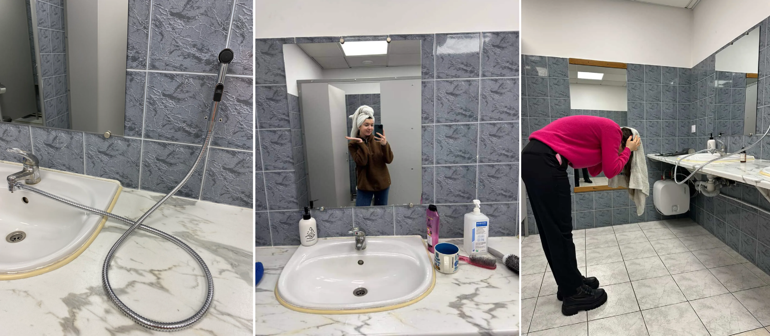 Водночас менеджерка програм Мар’яна Гулевич зізнається: тепер носить із собою цілий набір засобів гігієни – на випадок, якщо десь з’явиться вода чи можливість помити голову. На роботі є генератор, тож вона починає день із догляду за шкірою прямо в офісі. Колеги навіть облаштували імпровізований “салон”: під’єднали шланг із душовою лійкою до раковини й купили фен.