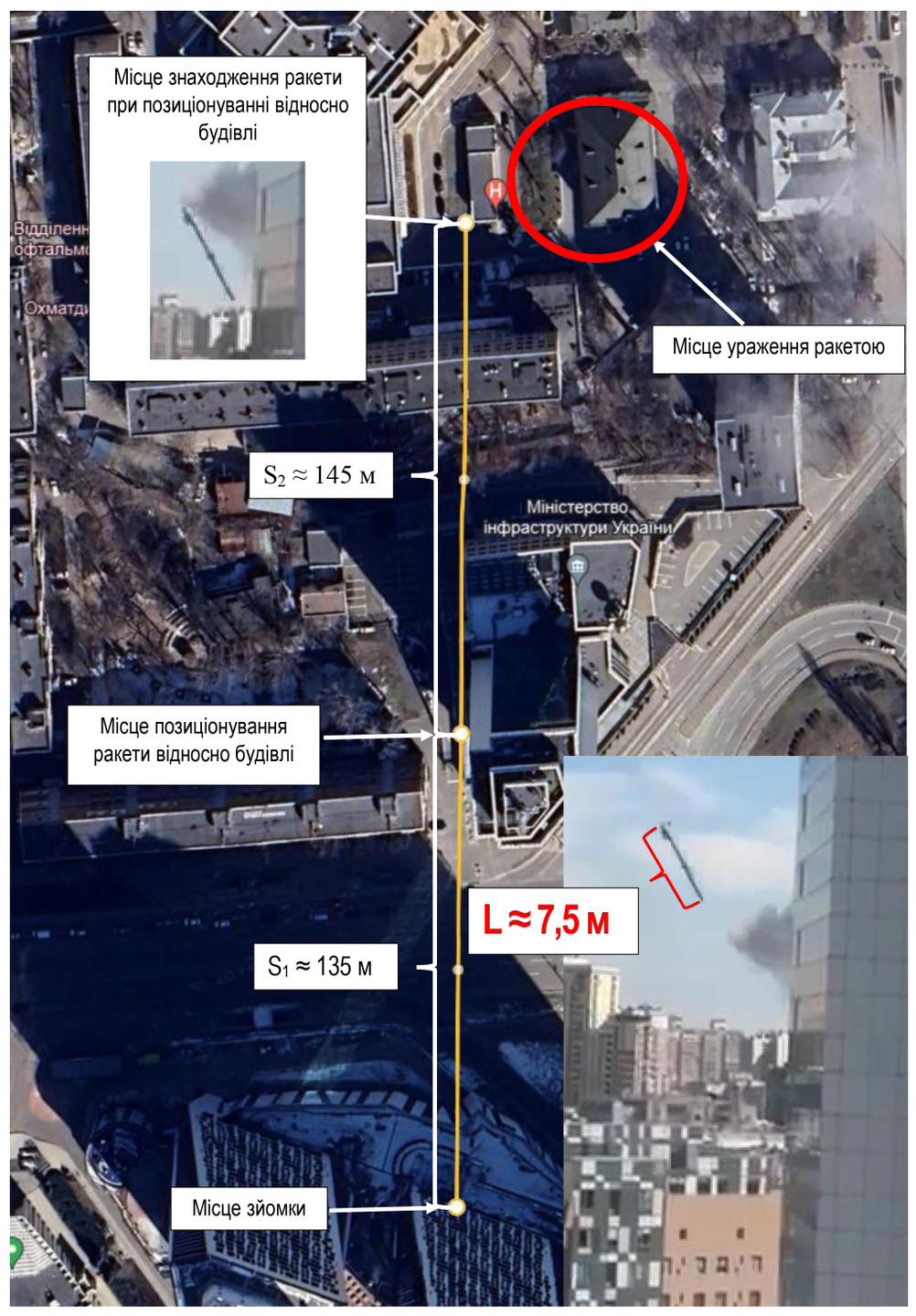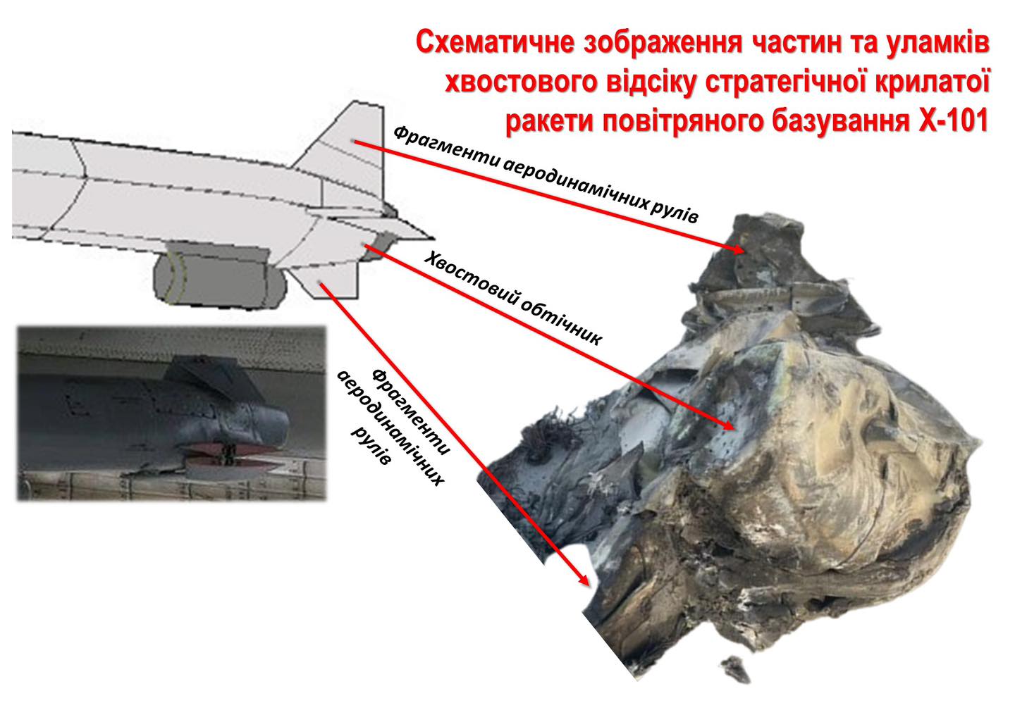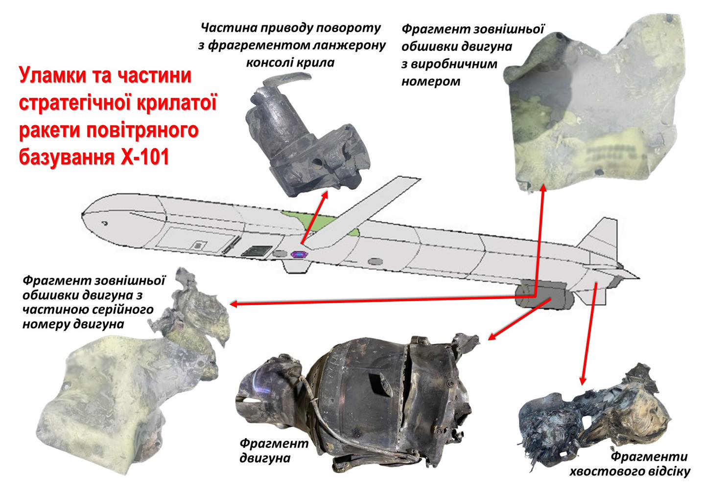 Специфічні інженерно-конструкторські особливості знайдених уламків та відповідні типові маркування свідчать про застосування збройними силами російської федерації стратегічної крилатої ракети повітряного базування типу Х-101. Її довжина складає 7,5 м, бойова частина – близько 400 кг, максимальна швидкість – 720 км/год, дальність польоту – до 5000 км, – зазначив заступник міністра юстиції Андрій Гайченко.