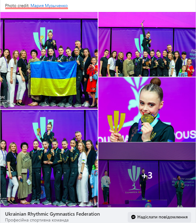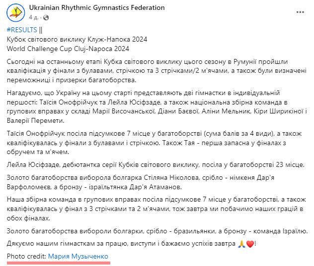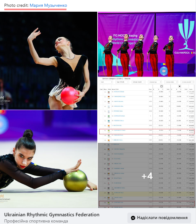 Фотографиня Національної збірної команди з художньої гімнастики Марія Музиченко опублікувала допис про підтримку гімнастки з Росії Віри Туголукової, а пізніше видалила його.