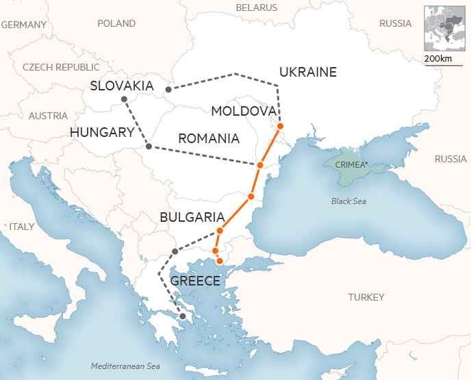 Регазифікований газ мають намір транспортувати на Балкани й у напрямку України через “вертикальний коридор” та маршрути типу газопроводу TAP й інтерконектора Греція-Болгарія.