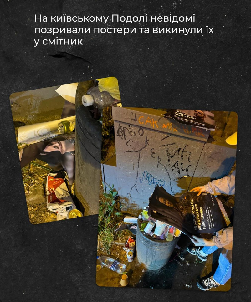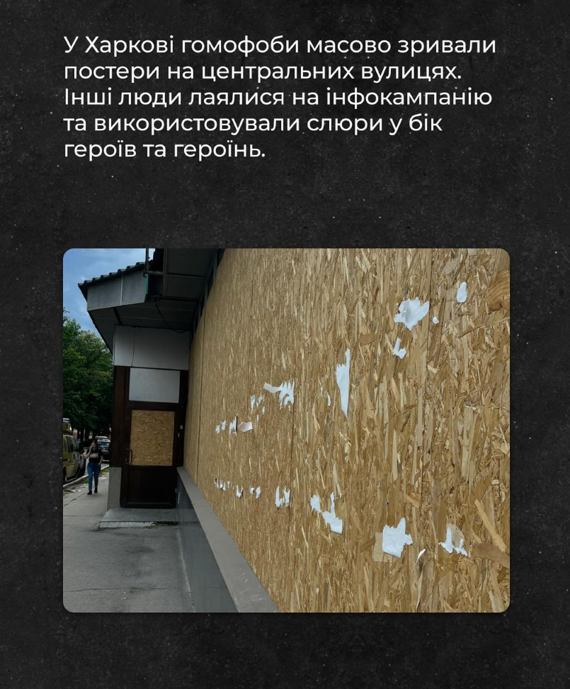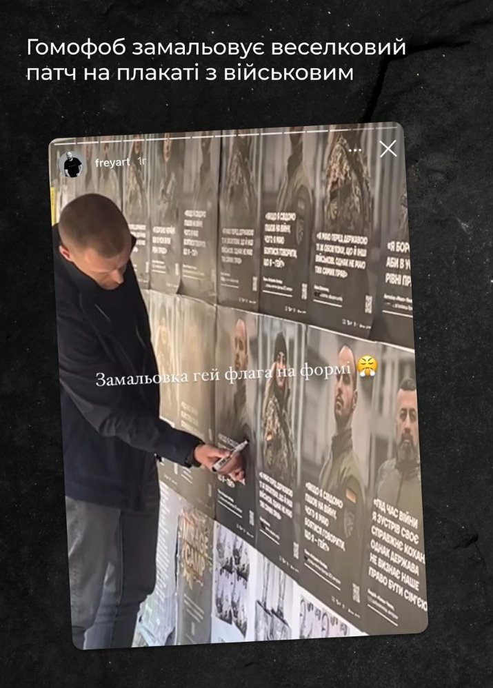 Гомофоби спаплюжили постери із зображеннями українських ЛГБТК+ військових, розміщені у трьох містах України в межах інфокампанії на підтримку ЛГБТК+ захисників та захисниць.