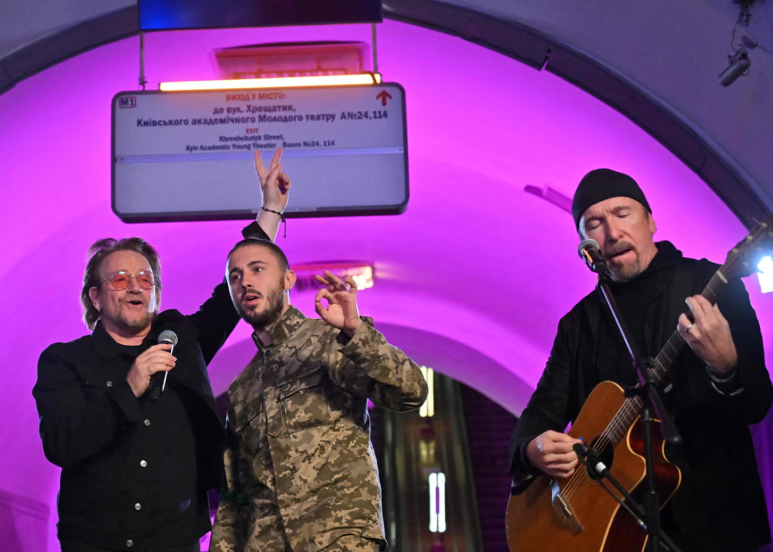 - У лютому 2024 року ірландський рок-гурт U2 дав концерт у Лас-Вегасі. Під час виступу фронтмен гурту Боно звернувся до влади США, закликавши надати українським військовим усе необхідне. Він нагадав, що нині в Україні борються за свободу усього демократичного світу.