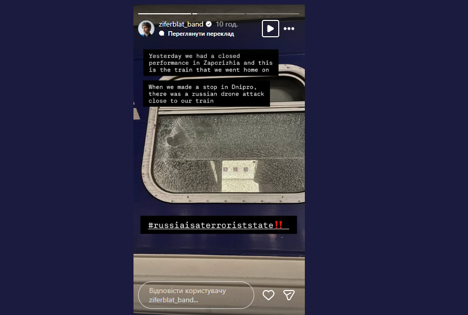Як розповіли хлопці, вони поверталися додому після виступу в Запоріжжі, коли поруч з потягом вдарив російський БПЛА. До свого повідомлення вони додали фотографію, на якій видно розбите вікно у вагоні, де їхав гурт.