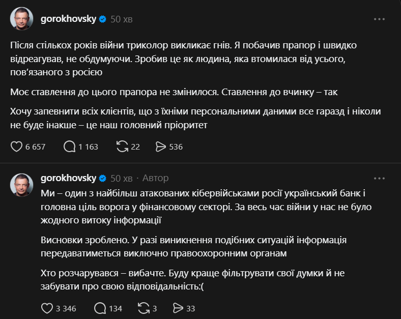 Співзасновник популярного мобільного банку monobank Олег Гороховський опублікував офіційне вибачення перед клієнткою, чиї персональні дані він раніше оприлюднив у соціальних мережах. Приводом для скандалу стала фотографія дівчини, на фоні якої банкір помітив триколор. Однак, як з’ясувалося пізніше, на знімку був зображений державний прапор Словенії, а не Російської Федерації.