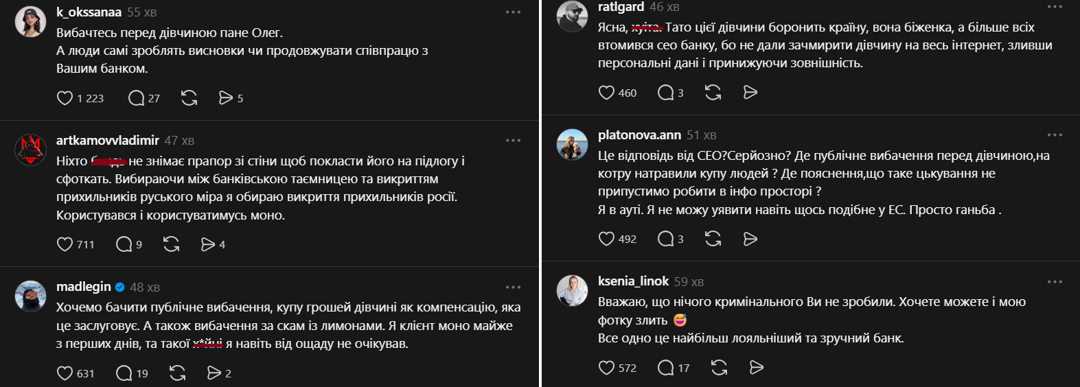 “Те що вибачитись перед дівчиною треба, то факт. Але, ви вже показали своє ставлення до клієнтів і банківської таємниці. Ви вже злили інфу у простір. Тож, вибачатись ви, чи ні, однозначно, надійності інформації у вашому банку немає. А ще, ви порушили купу законів. Тут вибачення не допоможуть. Закон є закон. Треба відповідати!”, – йдеться у одному з коментарі.