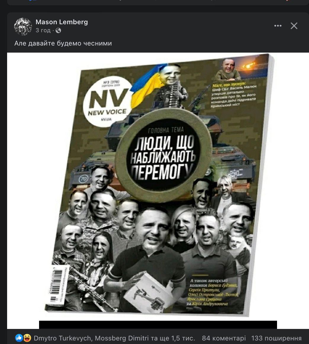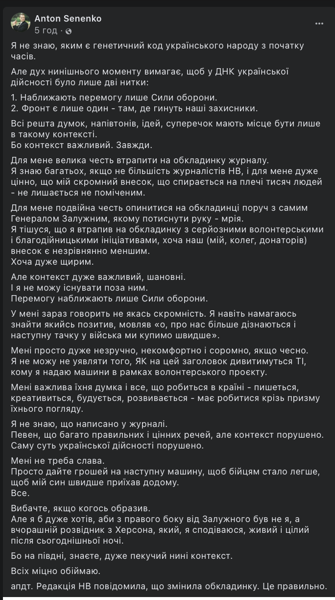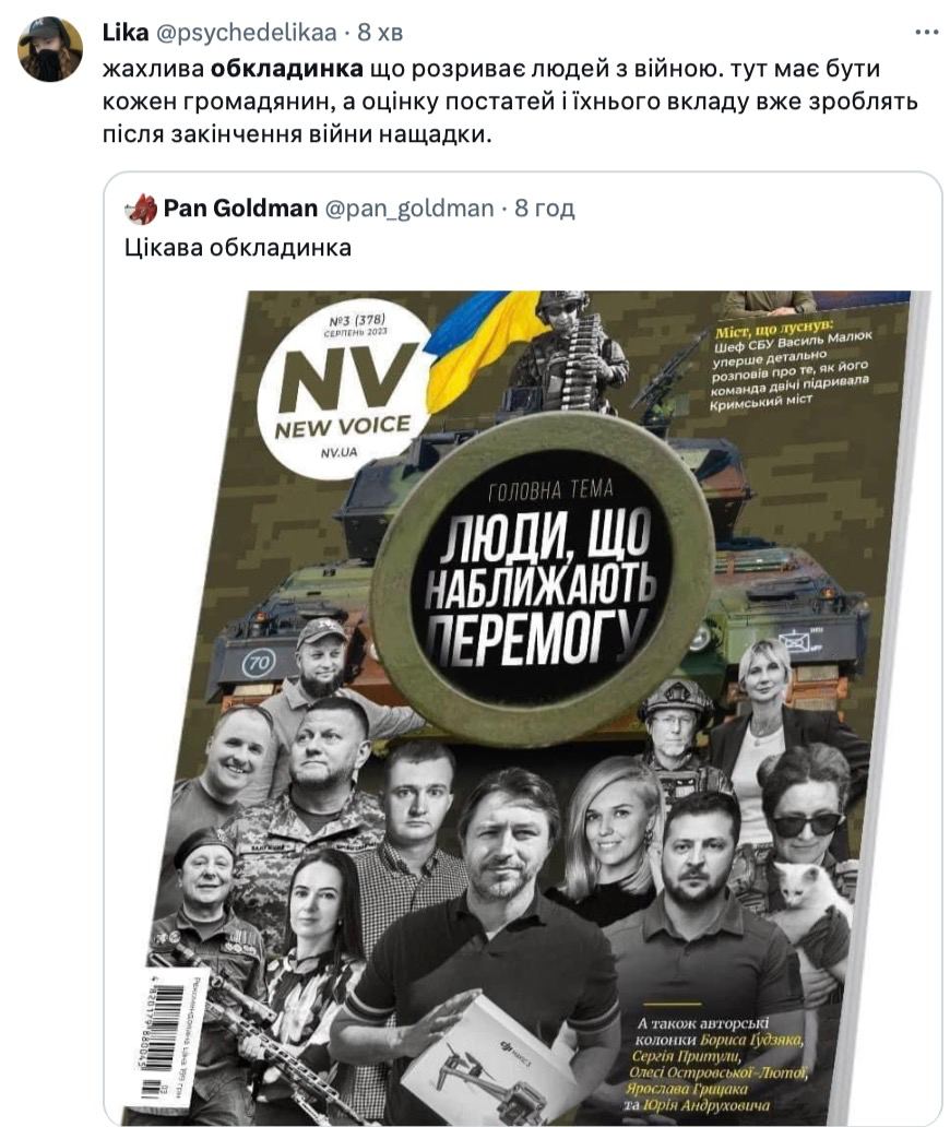 Це все достойні люди. Але ця наша обкладинка – невдала ідея. Більш того, це помилка, бо ми образили багатьох людей. На неї не потрапили багато інших українців, які теж роблять величезний внесок у наближення перемоги. Зараз не час міряти зусилля, ця тема поляризує. Ми усі робимо один великий внесок. І робити його доведеться ще деякий час, — зазначив головний редактор.