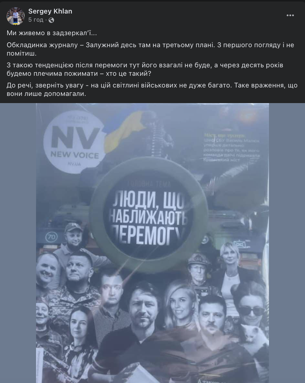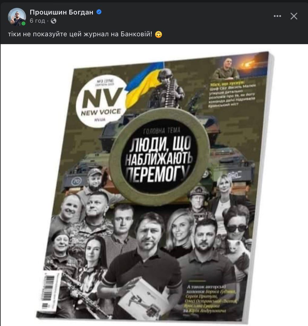 Нещодавно нова обкладинка журналу New Voice викликала хвилю обурення серед користувачів соцмереж. Невдоволення пов’язане з розставленням пріоритетів, зокрема у центрі ілюстрації розмістили світлину волонтера Сергія Притули, вже за ним — військовослужбовців, політиків, включно з президентом Володимиром Зеленським та головнокомандувачем ЗСУ Валерієм Залужним. Головний редактор Віталій Сич анонсував зміну рішення, зауваживши, що тепер на обкладинці не буде конкретних осіб, лише народ України.