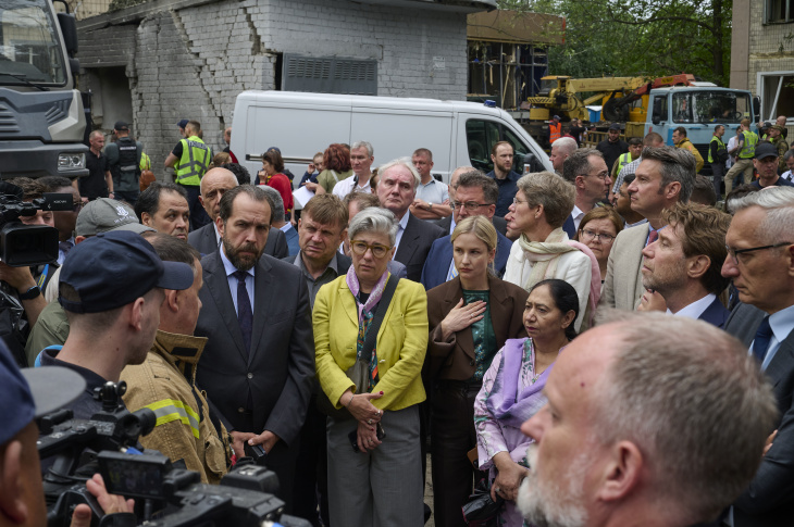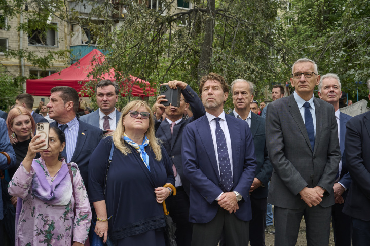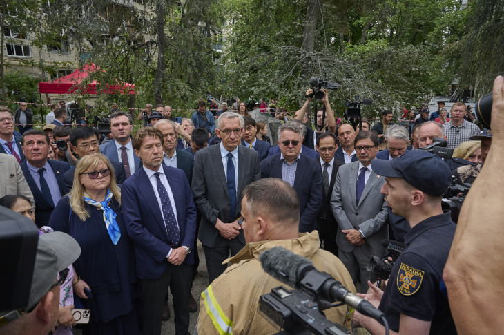 До зруйнованого будинку прибули представники понад 60 дипломатичних місій, акредитованих в Україні, зокрема посли та тимчасові повірені. Міністерство закордонних справ висловлює вдячність іноземному дипломатичному корпусу за солідарність з Україною та українським народом на тлі російської агресії та варварських ударів.