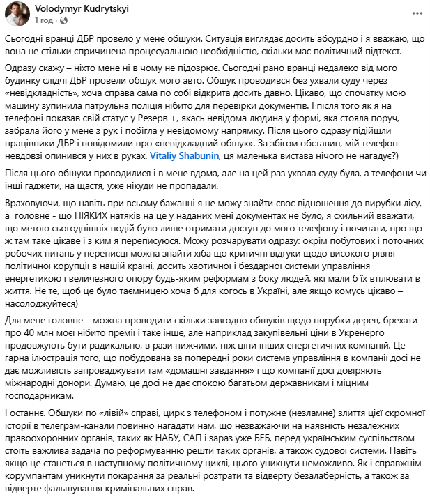 Мова про штучне завищення обсягів вирубки лісу й вартості робіт під час будівництва енергомагістралей. Джерела ЗМІ раніше повідомляли, що обшуки також проходять в “Укренерго”, в приміщеннях підрядної організації та інших, як вважають в ДБР, залучених до схеми підприємств. Тоді як видання “Економічна правда” пише, що правоохоронці відкрили не одне кримінальне провадження через можливі зловживання Кудрицького під час його перебування на посаді очільника “Укренерго”.