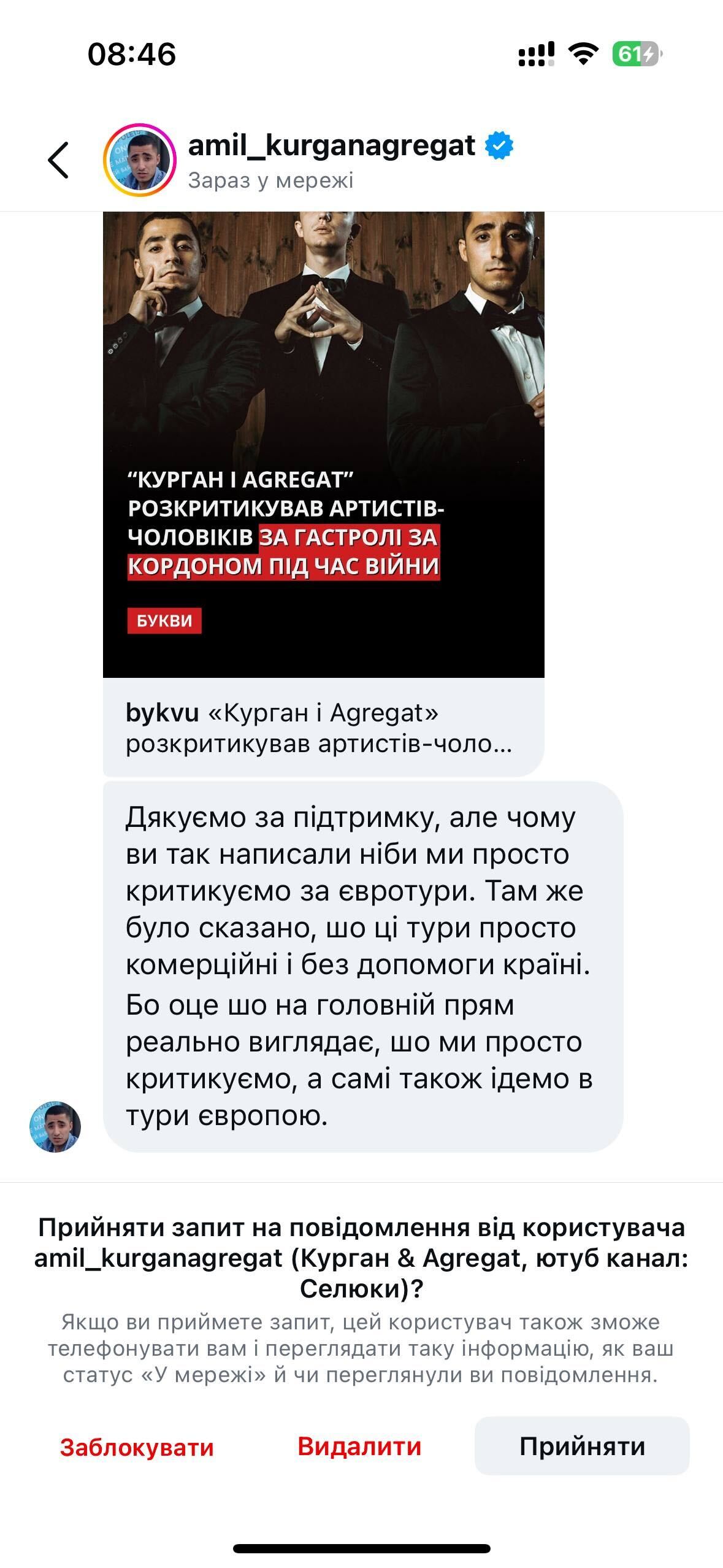 У приватних повідомленнях Аміл Насіров також подякував Буквам за підтримку, та водночас наголосив, що гурт не критикує просто євротури, а має на увазі саме тих артистів, які зі своїх закордонних турів не допомагають Збройним силам України.