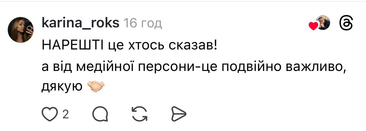 На заяву гурту відреагувала блогерка Олена Мандзюк. Вона підтримала позицію колективу: