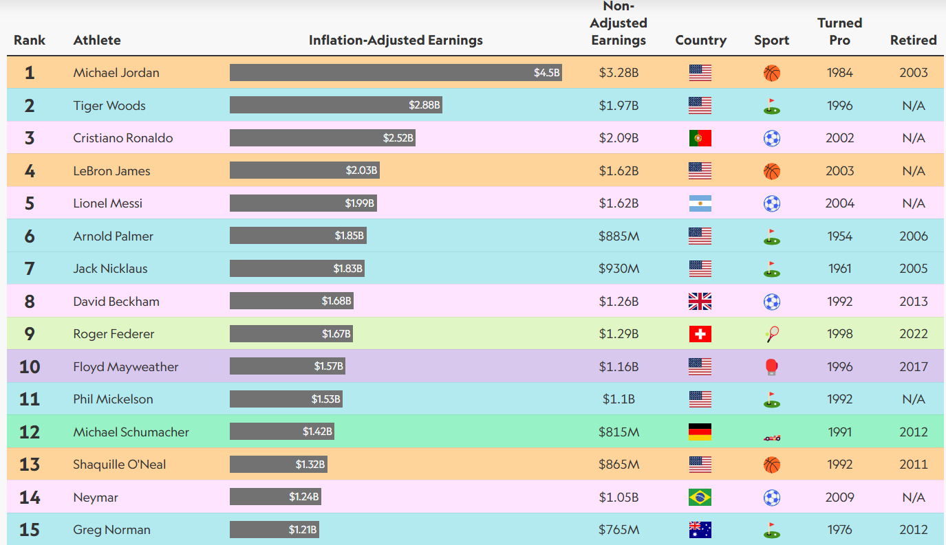 Шестиразовий чемпіон НБА Майкл Джордан заробив 3,28 млрд доларів (4,5 млрд з урахуванням інфляції).