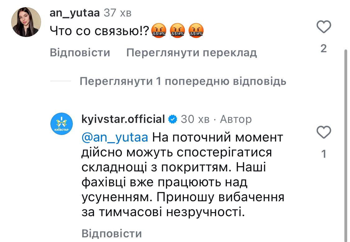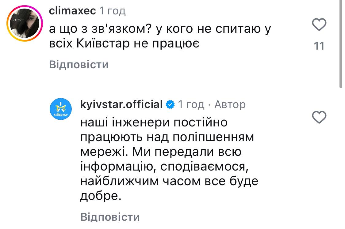 “На поточний момент дійсно можуть спостерігатися складнощі з покриттям. Наші фахівці вже працюють над усуненням. Приношу вибачення за тимчасові незручності”, – відповіли у компанії.