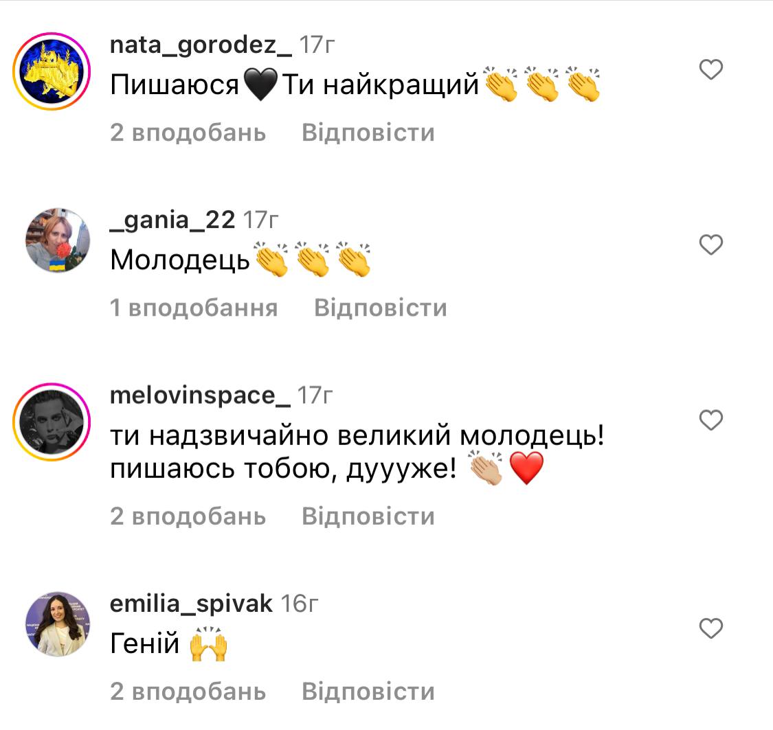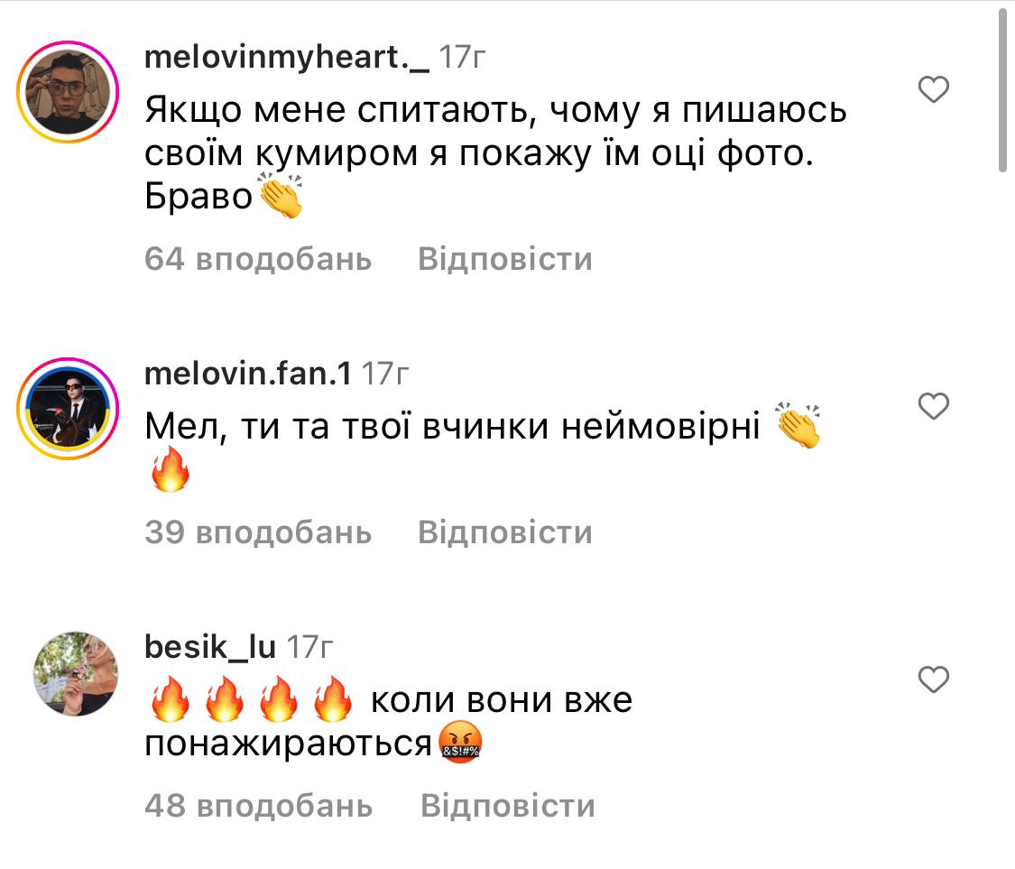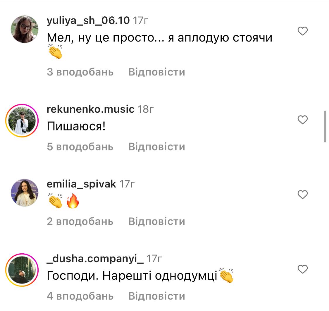 Серед українських співаків, які підтримали ідею Melovina в коментарях до допису – українська співачка Наталія Карпа та співак ENLEO.