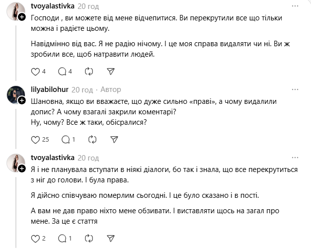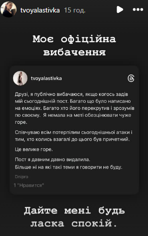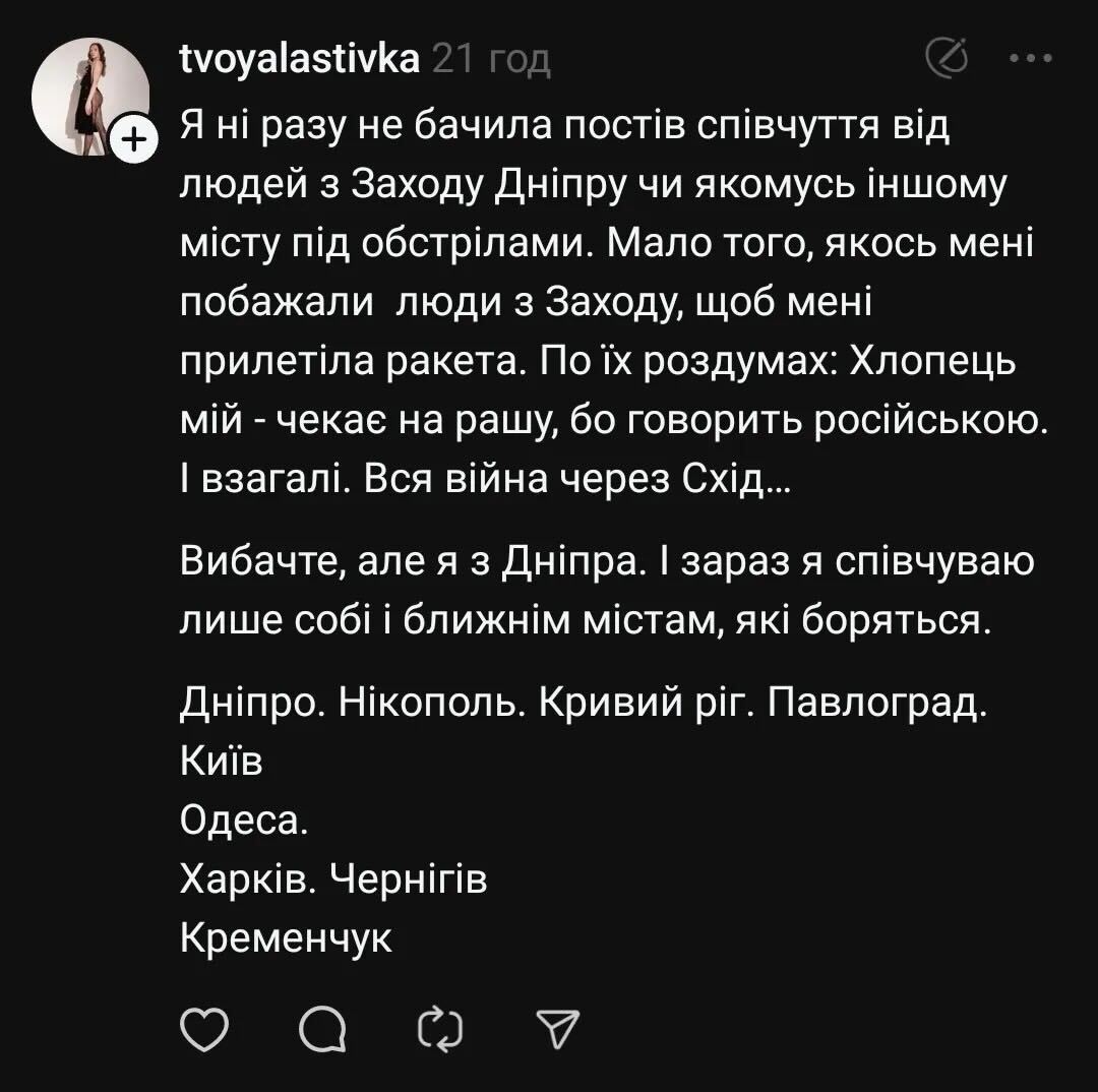 Після російської атаки Тернополя, внаслідок якого загинуло щонайменше 26 людей, у соцмережі Threads розгорівся скандал. Користувачка під ніком tvoyalastivka опублікувала пост, в якому заявила, що співчуває лише Дніпру і ближнім містам. Це викликало обурення, наразі жінка перепросила і видалила пост.
