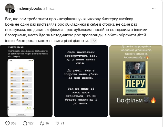 Після цього користувачка, яка в Instagram позиціює себе як книжкову блогерку, закрила коментарі. Однак, скандал не вщухав.