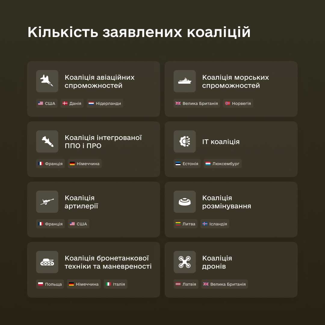 Станом на зараз вже створено 8 коаліцій, серед них такі як коаліція авіаційних спроможностей, коаліція протиповітряної і протиракетної оборони.