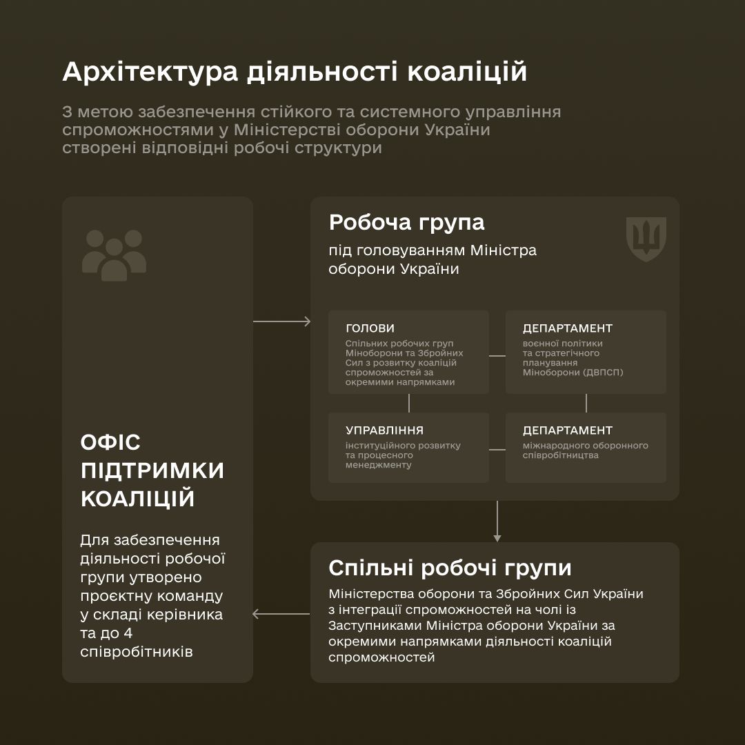 Офіс підтримує діяльність робочої групи на чолі з міністром оборони України та робочих груп з представників Міноборони та ЗСУ на чолі із заступниками міністра за напрямками діяльності кожної коаліції.