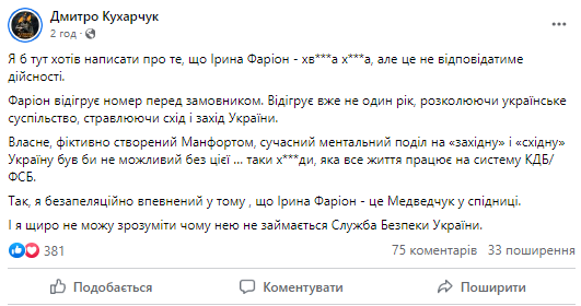 У нещодавньому інтерв’ю для проєкту “Рандеву” Фаріон розкритикувала захисників, котрі спілкуються російською мовою. Одначе, низка активістів прокоментували заяву екснардепки, зауважуючи на неприйнятності таких висловлювань під час війни.