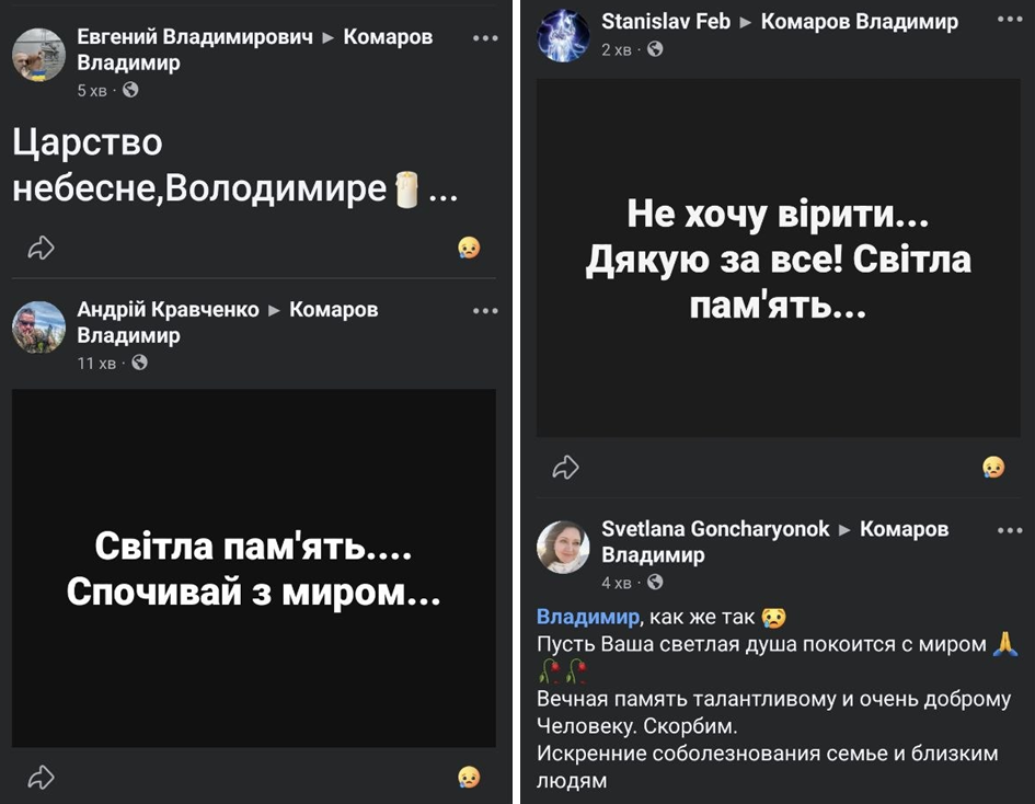 “Вчора, 29 березня, пішов за Радугу Комарик, Вовка, Володимир Комаров. Фантастично талановитий, обдарований Богом, позитивний, добрий, харизматичний, справжній… Серцева недостатність… Просто немає слів”, – йдеться у повідомленні театру.