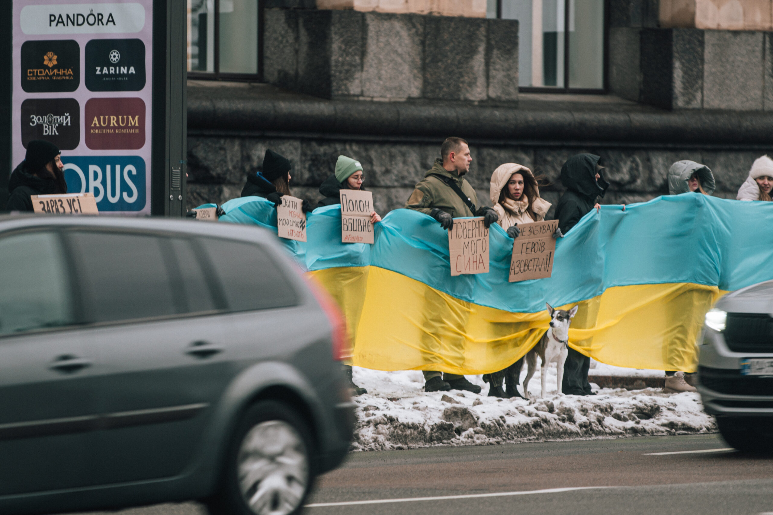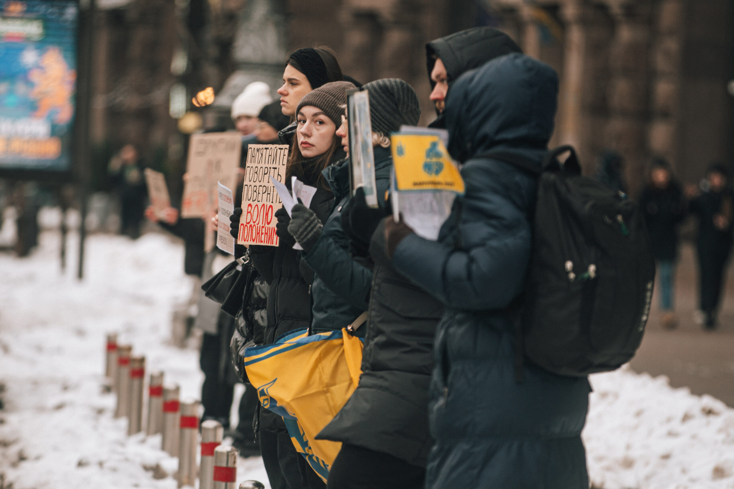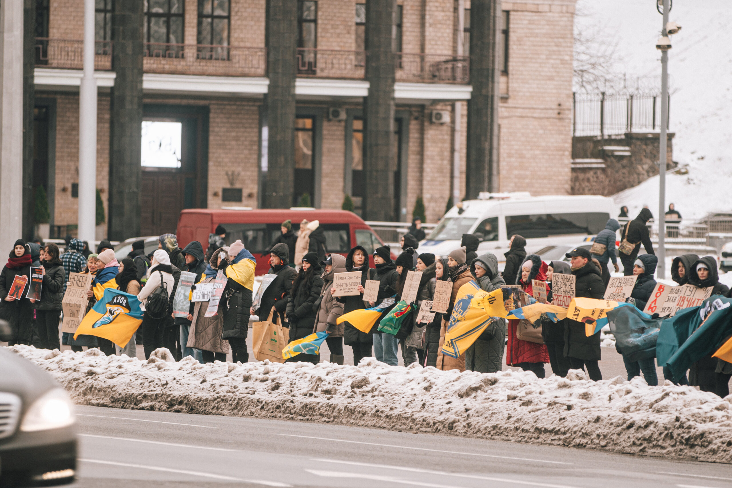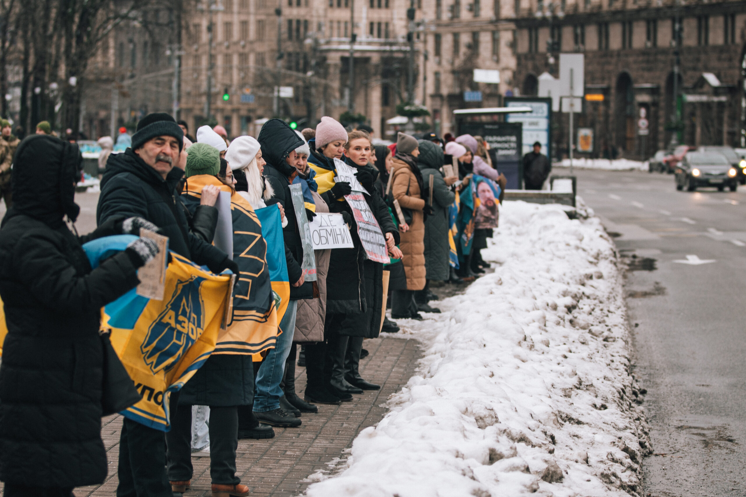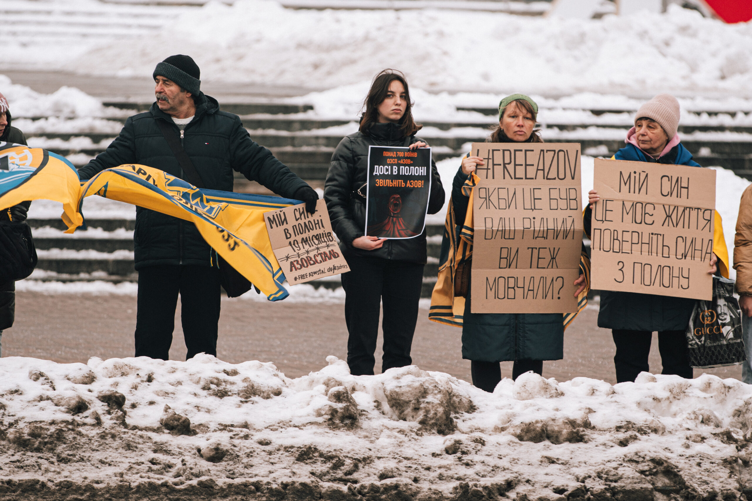 Тримаючи прапори та плакати, рідні полонених, друзі та просто небайдужі, котрі долучилися до акції, закликали звільнити військових, які вже півтора року перебувають у російському полоні.