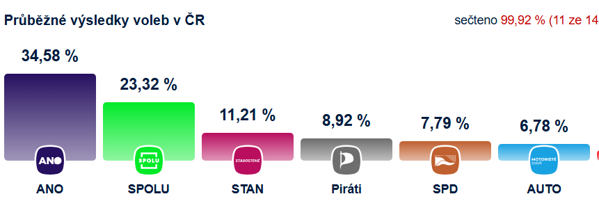 За результатами підрахунку голосів з 99,92% виборчих дільниць, проведеного Статистичним управлінням, рух Бабіша ANO набрав 34,58% голосів. Прозахідна коаліція чинного прем’єр-міністра Петра Фіали SPOLU отримала 23,32% голосів, партія STAN набрала 11,21% голосів, Pirati здобули 8,92% голосів.